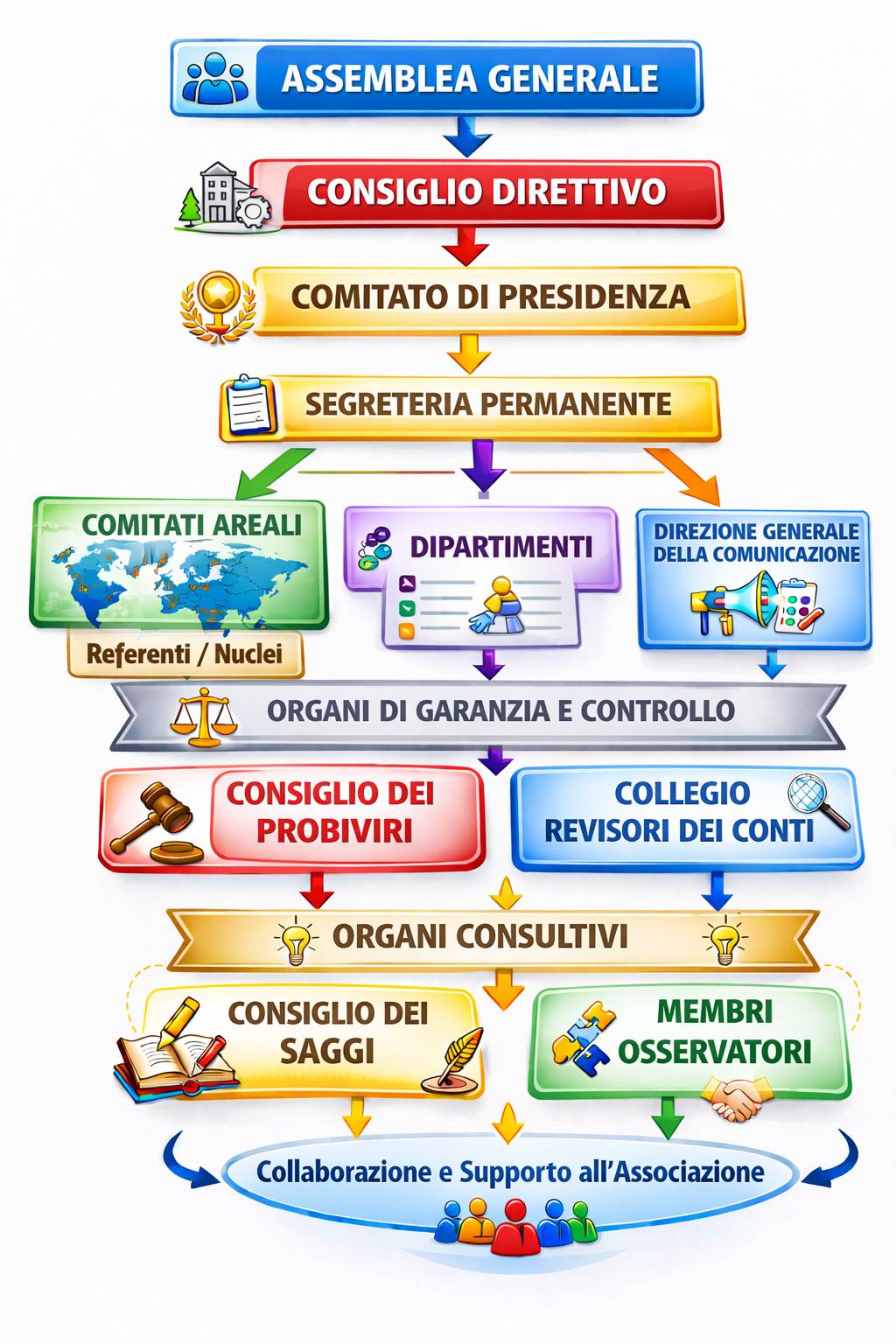 L'organizzazione dell'associazione è strutturata secondo un modello organizzativo e funzionale, che distingue tra organi di indirizzo associativo, strutture operative, organi di controllo e organismi consultivi. Assemblea Generale