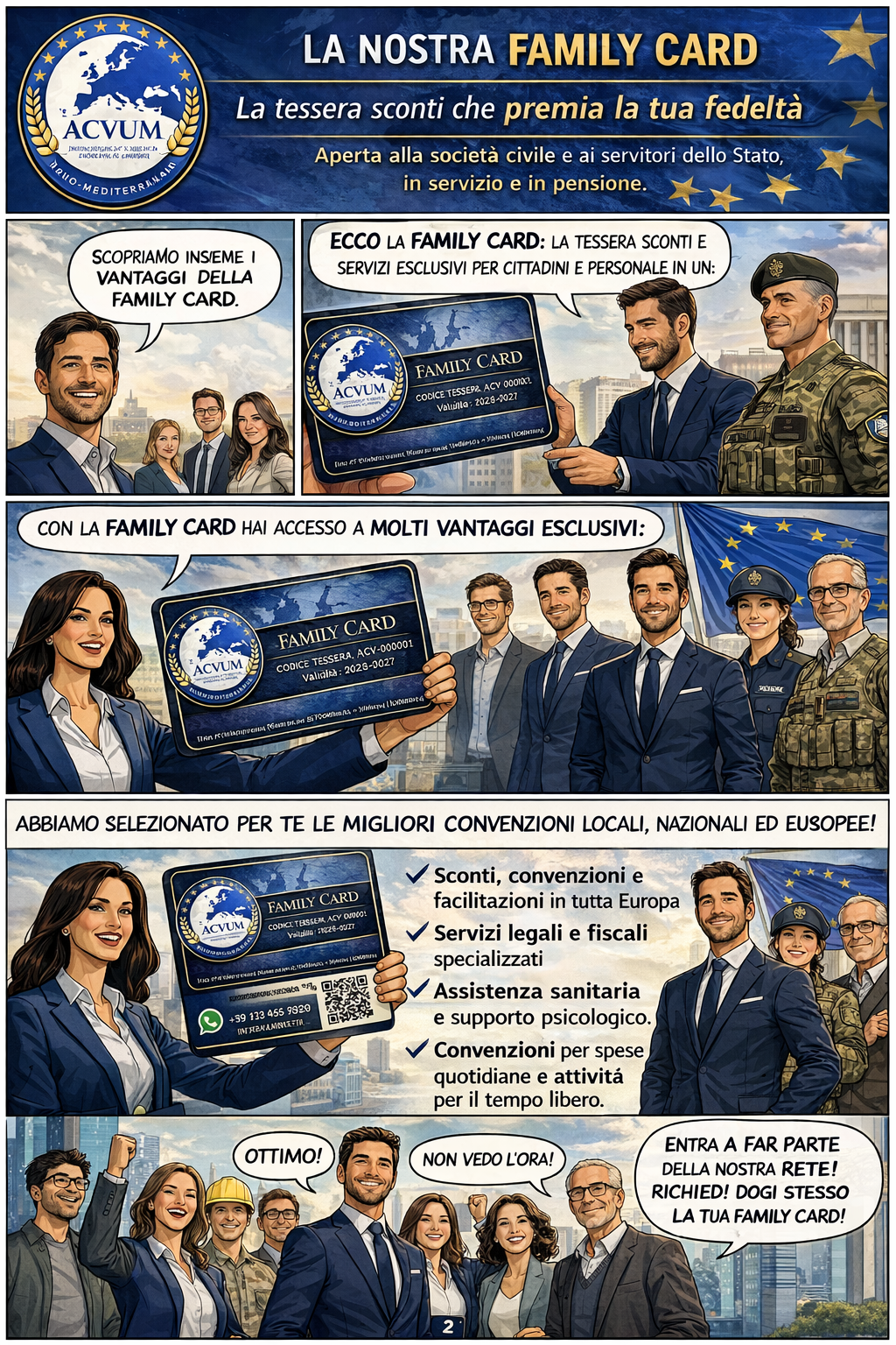 La Family Card ACVUM nasce come uno strumento sociale, associativo e progettuale volto a costruire una rete concreta di vantaggi, opportunità e servizi a favore di una platea ampia e coesa, composta da iscritti, familiari, cittadini vicini al sodalizio, veterani in uniforme e realtà associative unite all'Associazione in qualità di osservatori.
