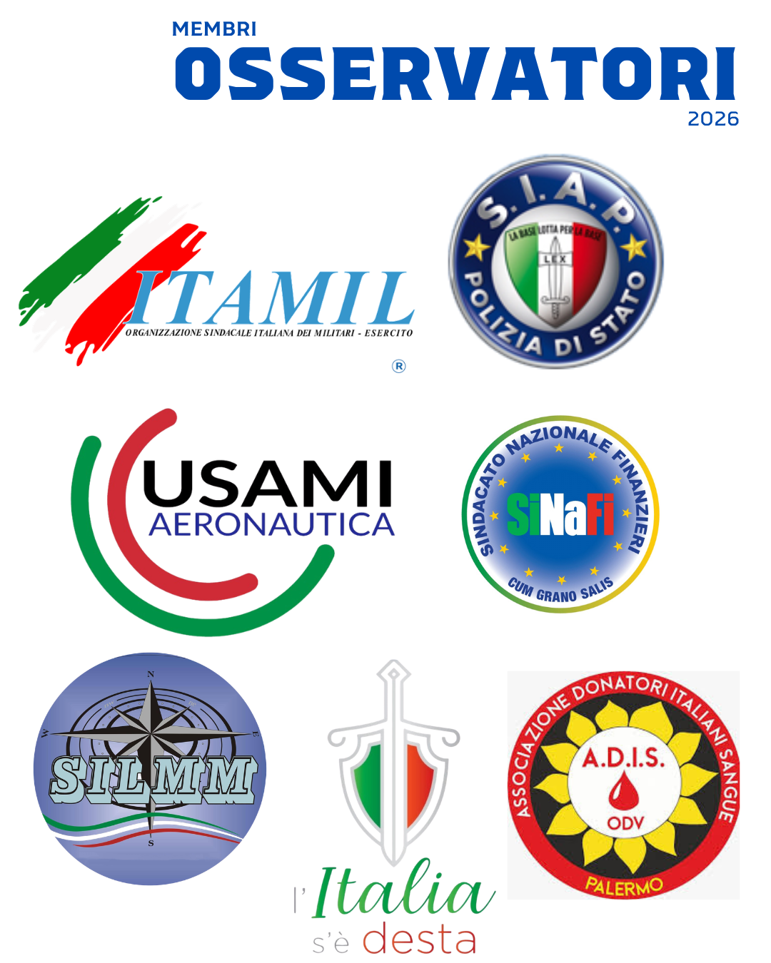 LE PRIME ADESIONI – MEMBRI Osservatori entrano nella rete associativa, in qualità di membri osservatori, importanti realtà italiane: ITAMIL Esercito; USAMI AERONAUTICA; S.I.A.P. – Polizia di Stato; Si.Na.Fi – Sindacato Nazionale Finanzieri; SILMM – Marina Militare; Associazione culturale "L'Italia s'è desta; "A.D.I.S. – Associazione Donatori Italiani Sangue (Palermo);